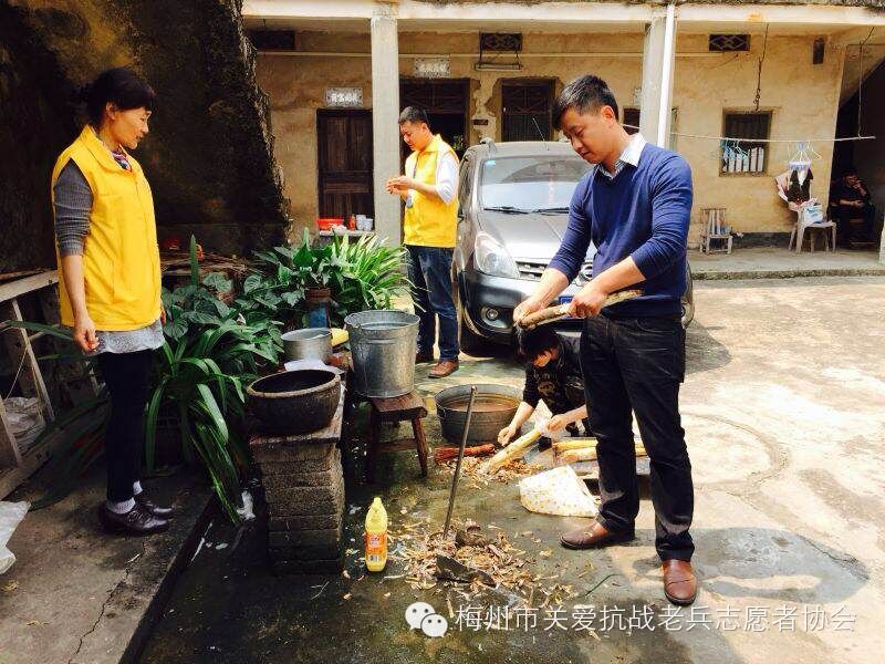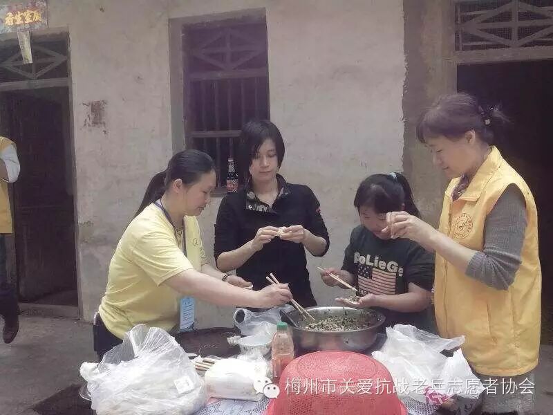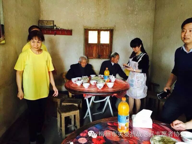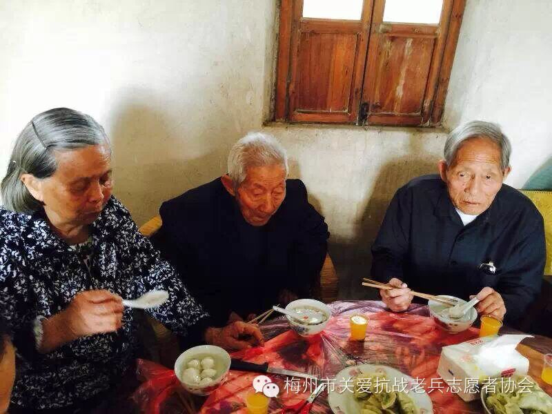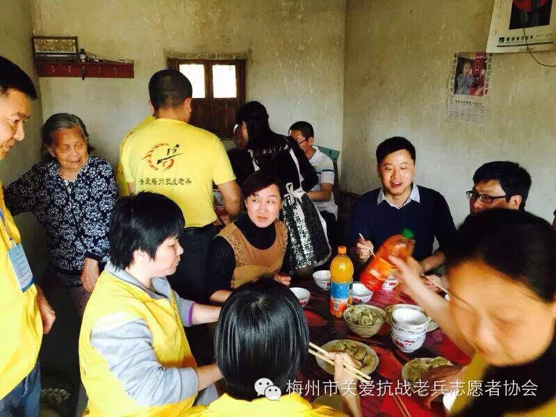2015年3月21日,我们梅州市关爱抗战老兵志愿者协会蕉岭服务队的志愿者徐光、丘利霞、钟昌礼(一家三口)、钟平、彭苑君、徐裕、丘艳玲等十多人,兵分二路,一组三圳镇,另一组新铺镇,专程把“梅州市叶剑英基金会”的关爱金和“梅州市关爱抗战老兵志愿者协会”的致敬金,一并送给抗战老兵:钟洪梅,曾巽德,李岳华,李育生,曾竹清等十一位爷爷家,中午我们二组汇合,一起到曾竹清爷爷家,队友们一起包饺子,煮酿豆腐肉圆汤。大家开开心心的,队员和老兵爷爷欢聚一堂,共进午餐,大家谈笑风生,妙语连珠。气氛非常活跃,关爱行动使老兵们非常感动,历史没有忘记他们,社会没有忘记他们。队友们都知道老兵爷爷都是90多岁高龄,时间这对老兵爷爷们是非常珍贵,作为志愿者,尽力在老兵们的有生之年,给予关心关怀和欢乐,让这些老兵爷爷们都能幸福的安度晚年和都能健康长寿。 (作者:钟平)