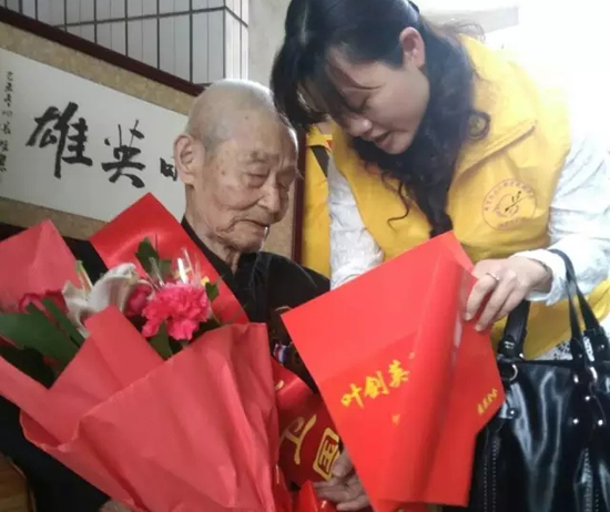 2016年4月23日,梅县区关爱抗战老兵志愿者前往松口圳头为百岁抗战老兵古禄恩爷爷敬赠“卫国勇士”纪念章。志愿者为古爷爷献上鲜花、抗日英雄牌匾,佩戴老兵绶带、纪念章,送上梅州市关爱抗战老兵志愿者协会发给老兵的关爱金500元和叶剑英基金会发给老兵的致敬金600元。都说人逢喜事精神爽,面对如此殊荣,大部分人或许都会兴奋不已。但百岁老兵古爷爷脸上显得特平静,给人一种“宠辱不惊,看庭前花开花落;去留无意,望天上云卷云舒”的神情。古爷爷的达观岂是我等晚辈所能企及!